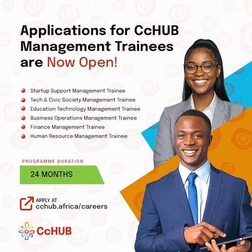 Applications are now open for the 2024 Co-creation Hub (CcHub) Management Trainee Programme. Co-creation Hub is Africa’s leading technology innovation ecosystem builder on a mission to accelerate the application of science, technology and social capital for economic prosperity across Africa.
