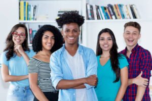 African male young adult with group of latin and caucasian and hispanic woman and man at classroom of university