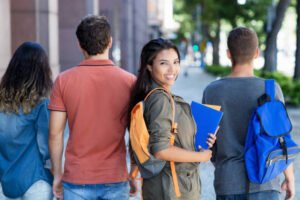 Beautiful mexican female student with group of young adults outdoor in city in summer